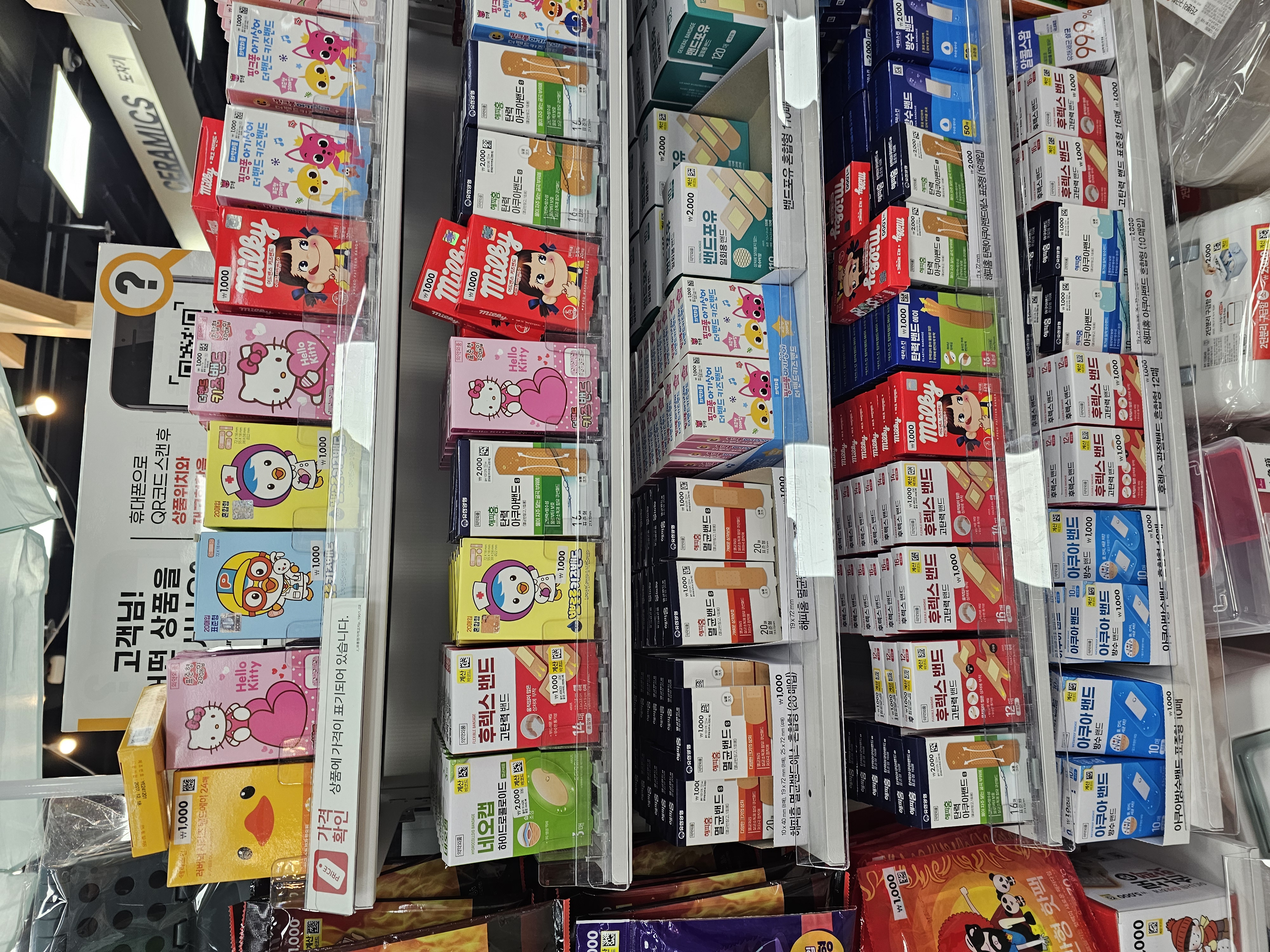 헬로키티, 뽀로로, 밀키, 핑크퐁 등 다양한 캐릭터 밴드가 한눈에 들어왔어요. 아이들이 특히 좋아할만한 디자인이라, 상처 났을 때 울고 있는 아이에게 붙여주면 기분이 한결 좋아질 듯해요. 가격은 보통 1,000원~2,000원 정도로, 10매 내외로 들어있어요. 디자인에 중점을 두다 보니 일반 밴드보다 양은 적지만, 특별한 날이나 외출용으로는 괜찮다고 생각해요. 밀키 밴드는 복고풍의 패키지가 예쁘고, 핑크퐁 밴드는 유아용으로 부드러운 재질이 특징이에요.