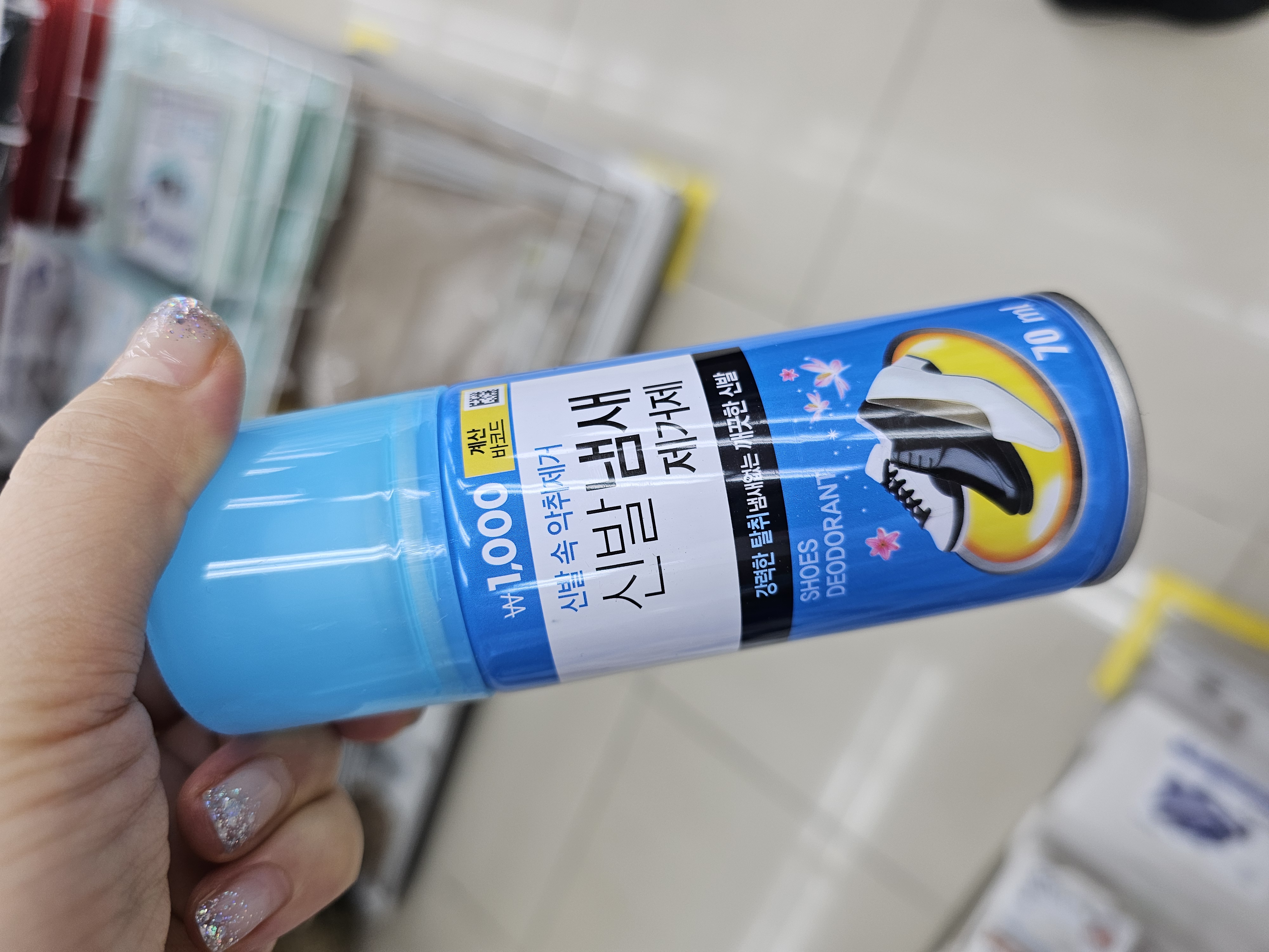 세 번째 제품은 파란색 뚜껑에 심플한 디자인의 신발 냄새 제거제입니다. 용량은 70ml로 세 가지 중 제일 작아요. 가격은 1,000원으로 부담 없지만, 양이 적기 때문에 오래 쓰기엔 부족한 느낌이 있습니다.