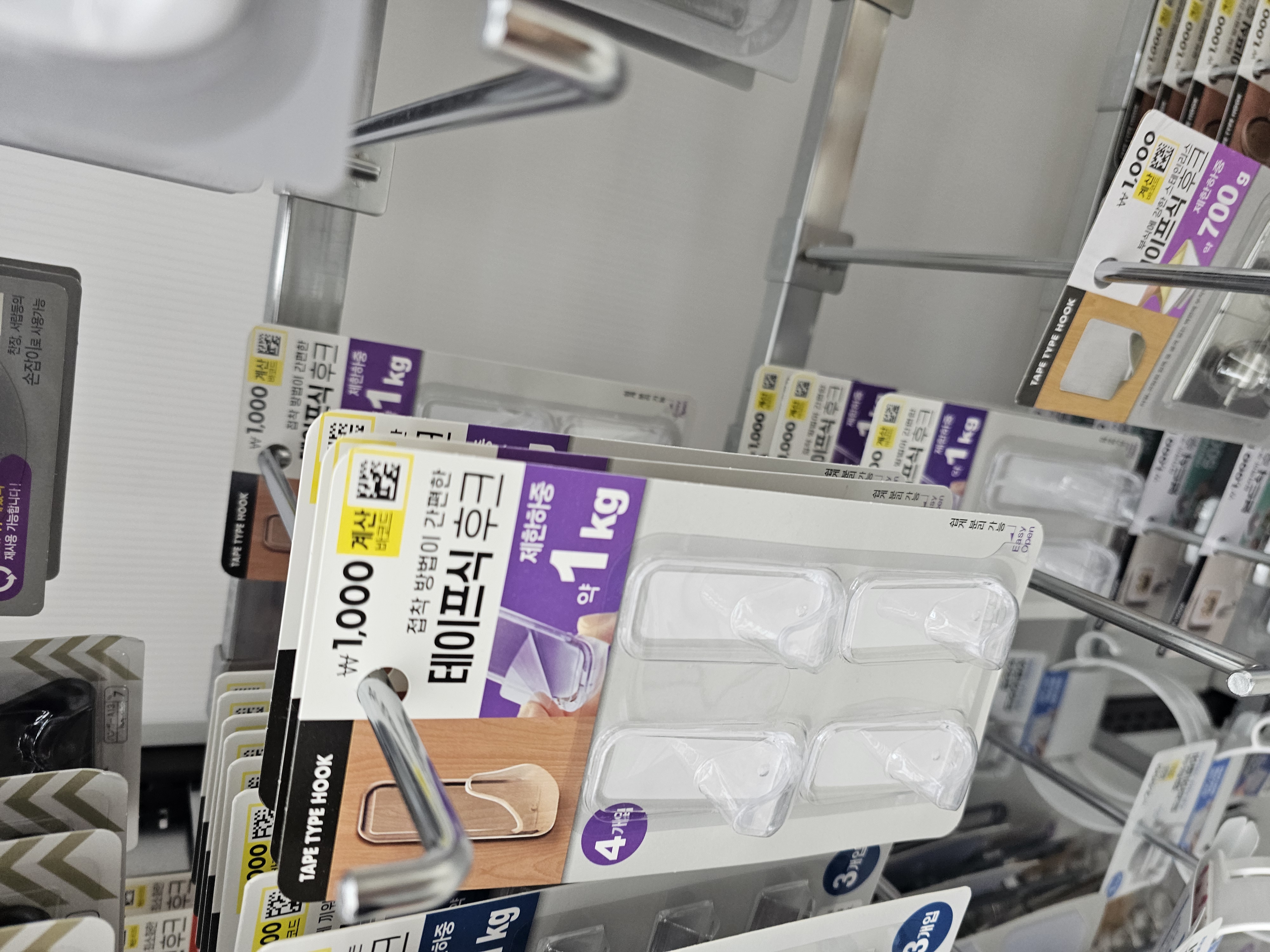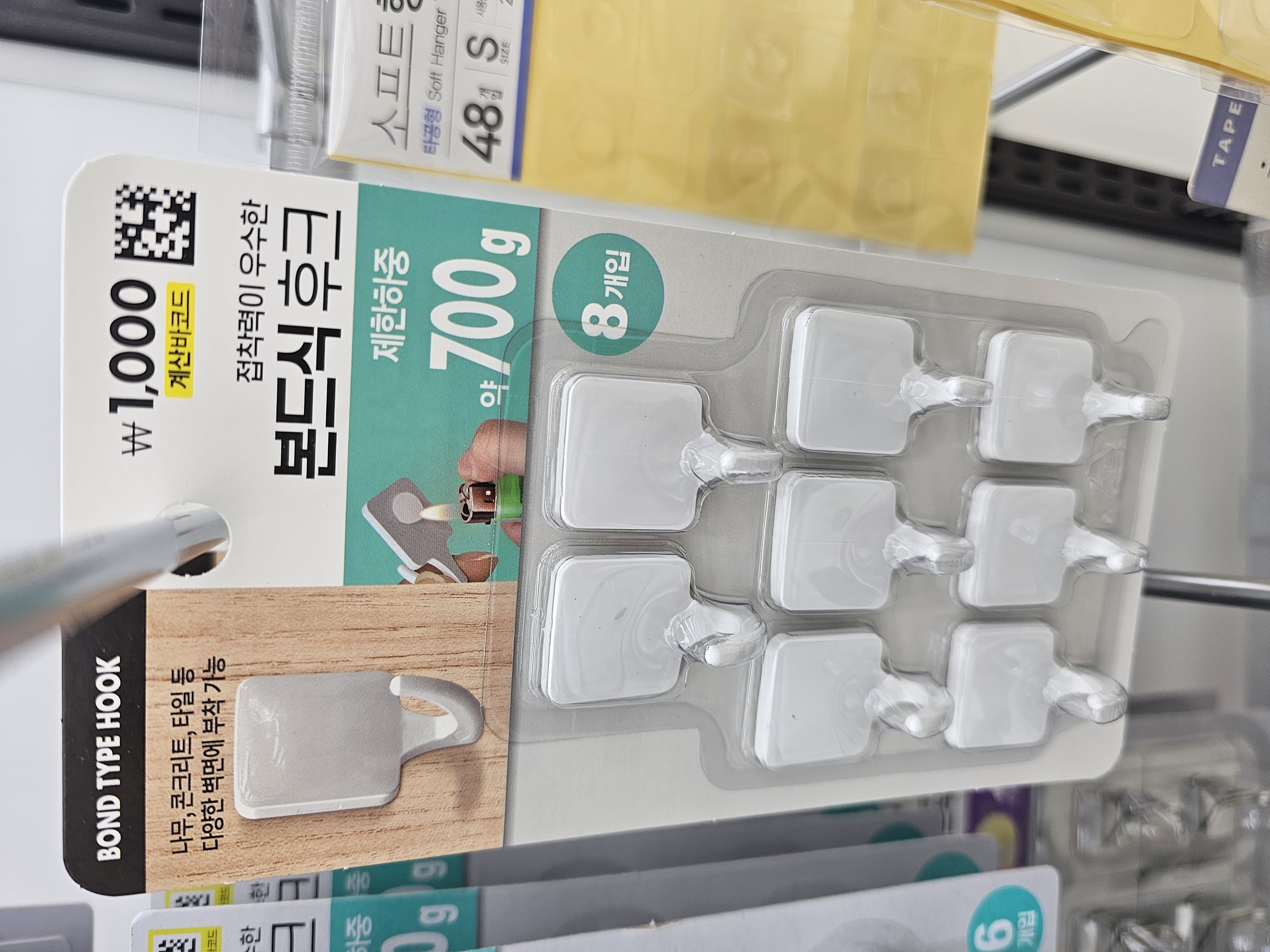 가격도 저렴하고, 설치가 간편해 집 안 곳곳에서 활용도가 높은 제품이죠. 오늘은 제가 직접 다이소에서 구입해 사용해본 본드식 후크(8개입, 약 700g 하중)와 테이프식 후크(4개입, 약 1kg 하중) 두 가지를 비교해가며 리뷰해보겠습니다.