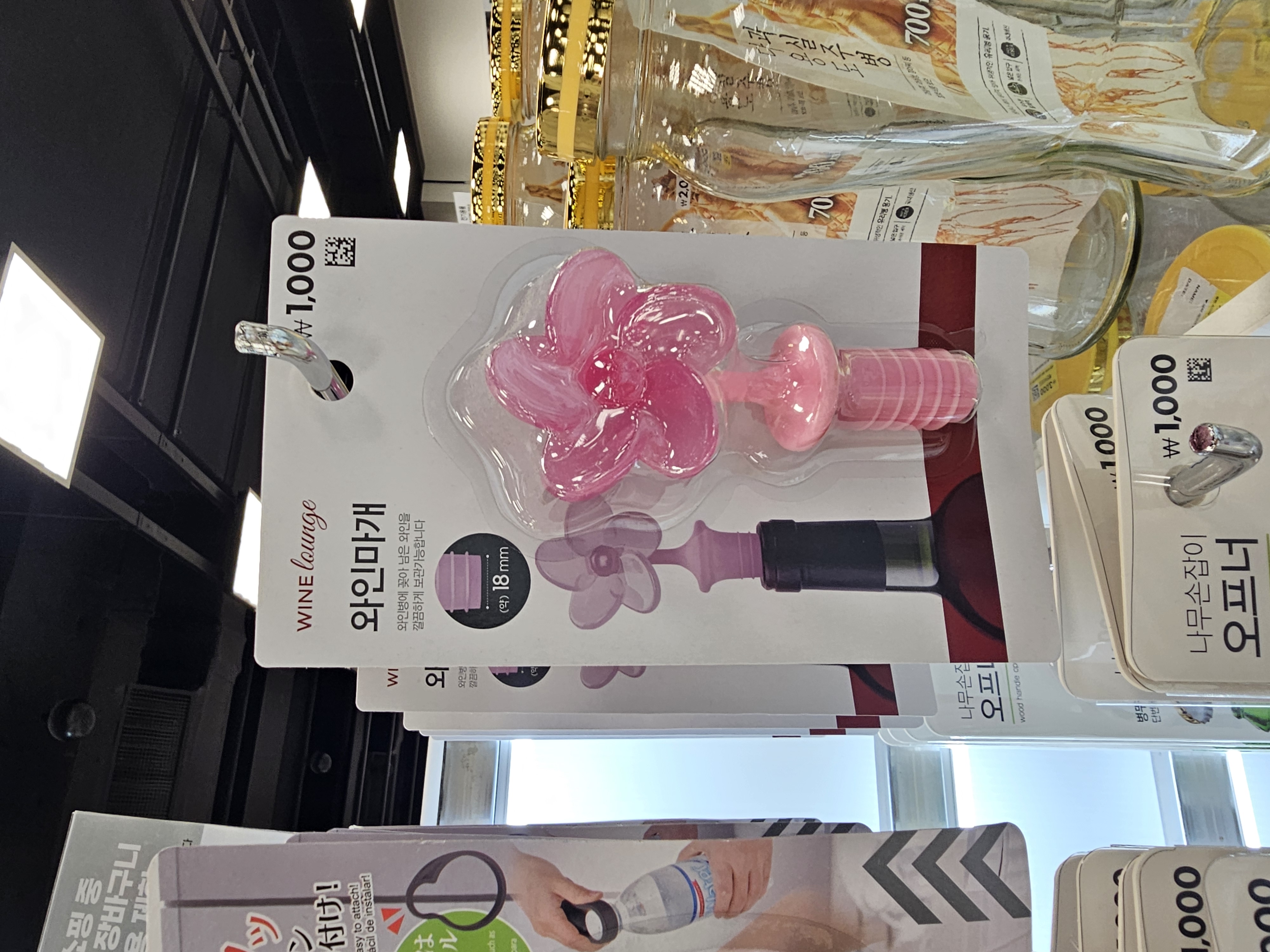 가장 먼저 눈에 띈 건 핑크색 꽃 모양 와인마개였어요. 디자인이 너무 귀엽고 포인트가 돼서 바로 집어왔습니다. 가격은 1,000원으로 부담 없고, 일반적인 와인병 입구(약 18mm)에 맞게 제작돼 있어요.
