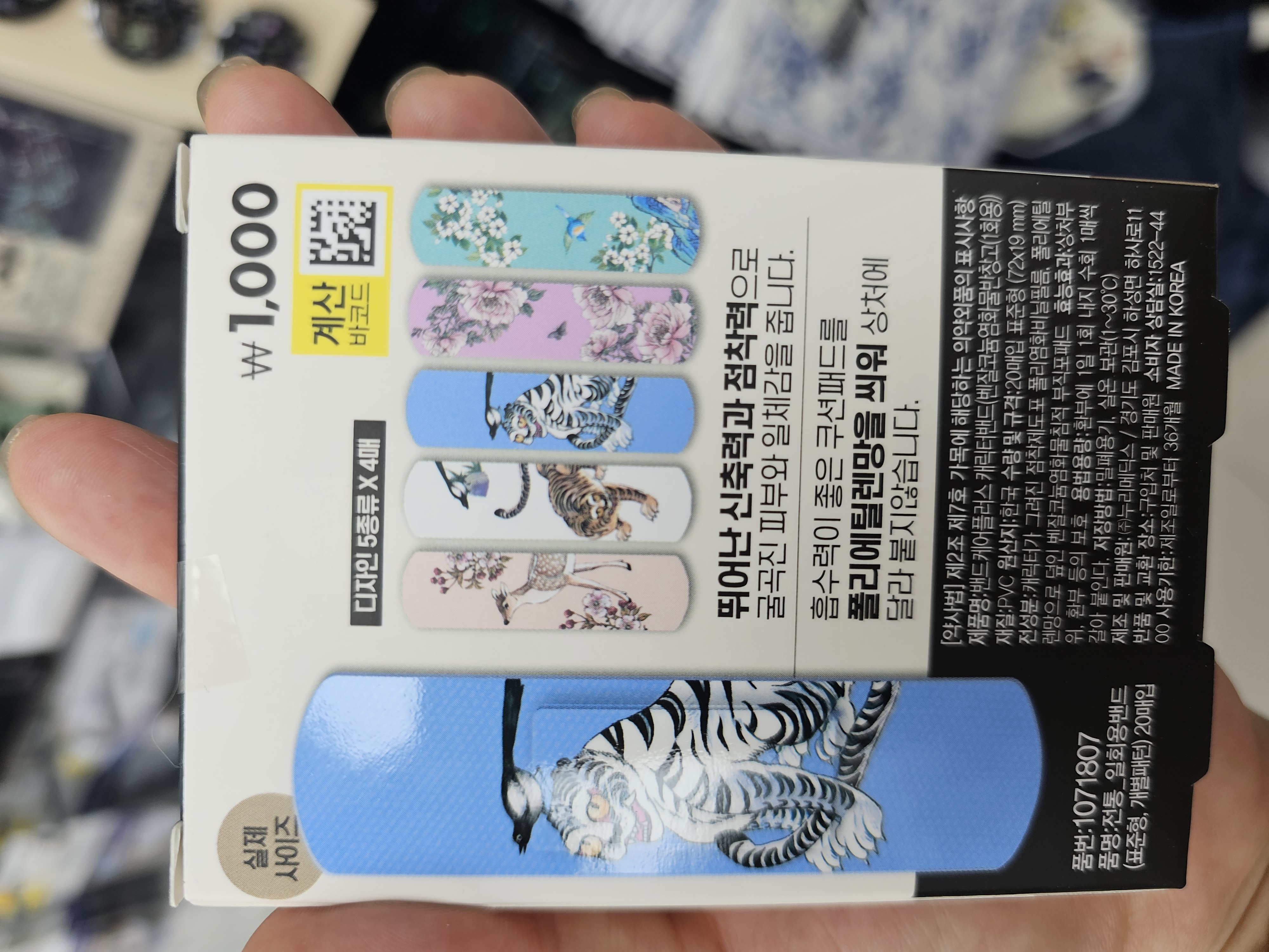 보통 밴드하면 살색이나 반투명 타입을 떠올리잖아요. 하지만 다이소 전통 밴드는 패키지부터 남달랐습니다. 청자무늬 밴드는 푸른 꽃문양이 들어가 고급스러운 느낌이 났고, 민화그림 밴드는 호랑이가 딱 그려져 있어서 강렬했습니다. 솔직히 밴드 패키지에 이렇게 신경 쓴 걸 처음 봤어요. 마치 미니 선물세트 같아서 선물용으로도 괜찮겠다 싶었습니다.