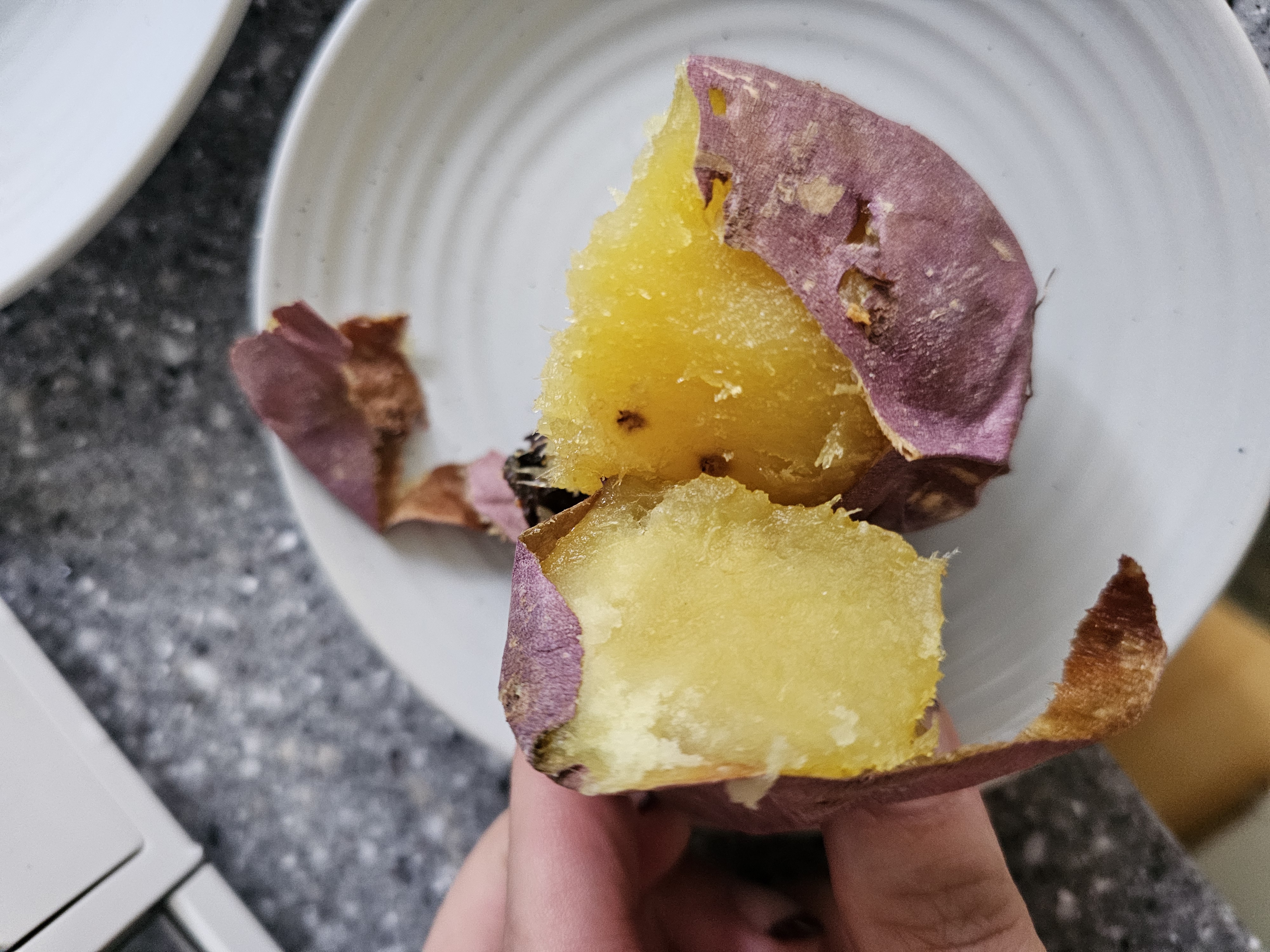 굽는 동안 달콤한 향이 퍼지고, 막 꺼냈을 때 껍질을 살짝 벌리면 노란 속살이 촉촉하게 올라오는 그 비주얼… 그냥 그대로 먹어도 맛있고, 꿀 찍어 먹을 필요도 없을 정도로 자연 단맛이 충분했습니다.
