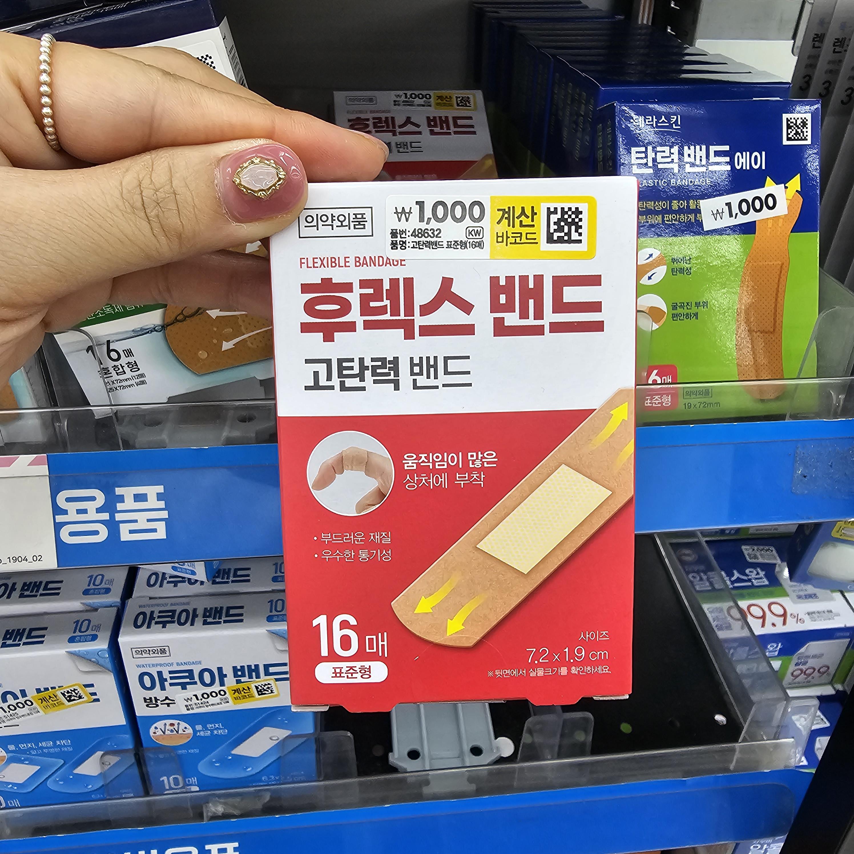 그외에도 다이소에 고탄력밴드인 후렉스밴드로 움직임이 많은 손가락이나 관절면에 사용하기 좋은 밴드도 있습니다 표준형밴드로 총16매로 구성되어 있으며 판매되는 가격은 천원입니다