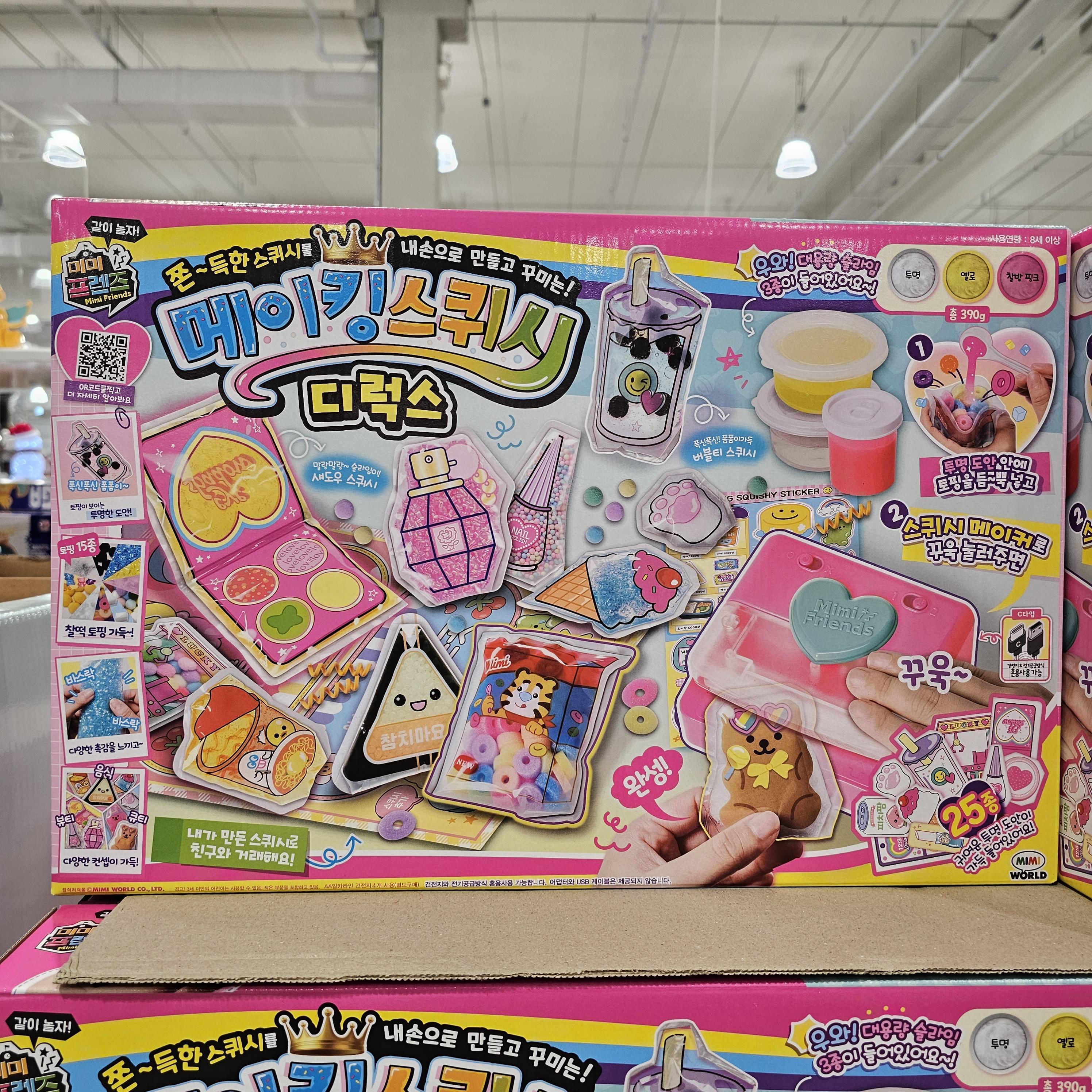 요즘 인기가 많은 메이킹스퀴시가 코스트코에서도 판매가 되고 있습니다 미미프렌즈에서 출시된 메이킹 스퀴시 디럭스제품이에요 스퀴시가 뭔지 궁금하신 분들이 계실 텐데요 말랑말랑 쫀득한 재질로 폭신한 느낌, 바스락거리면서도 다양한 질감을 느낄 수 있는데요 토핑을 어떤 걸 하느냐에 따라 촉감이 달라진답니다 각자의 취향과 선택에 따라 달라지는 스퀴시메이커는 작년부터 유행하기 시작하면서 아이들이 좋아하는 장난감으로 선물로 많이들 구매하셨던 장난감이었는데요 이번에 코스트코에서도 판매하더라고요 코스트코에서 판매되고 있는 가격은 43,990원으로 저는 코스트코 김해점에서 구매하였습니다