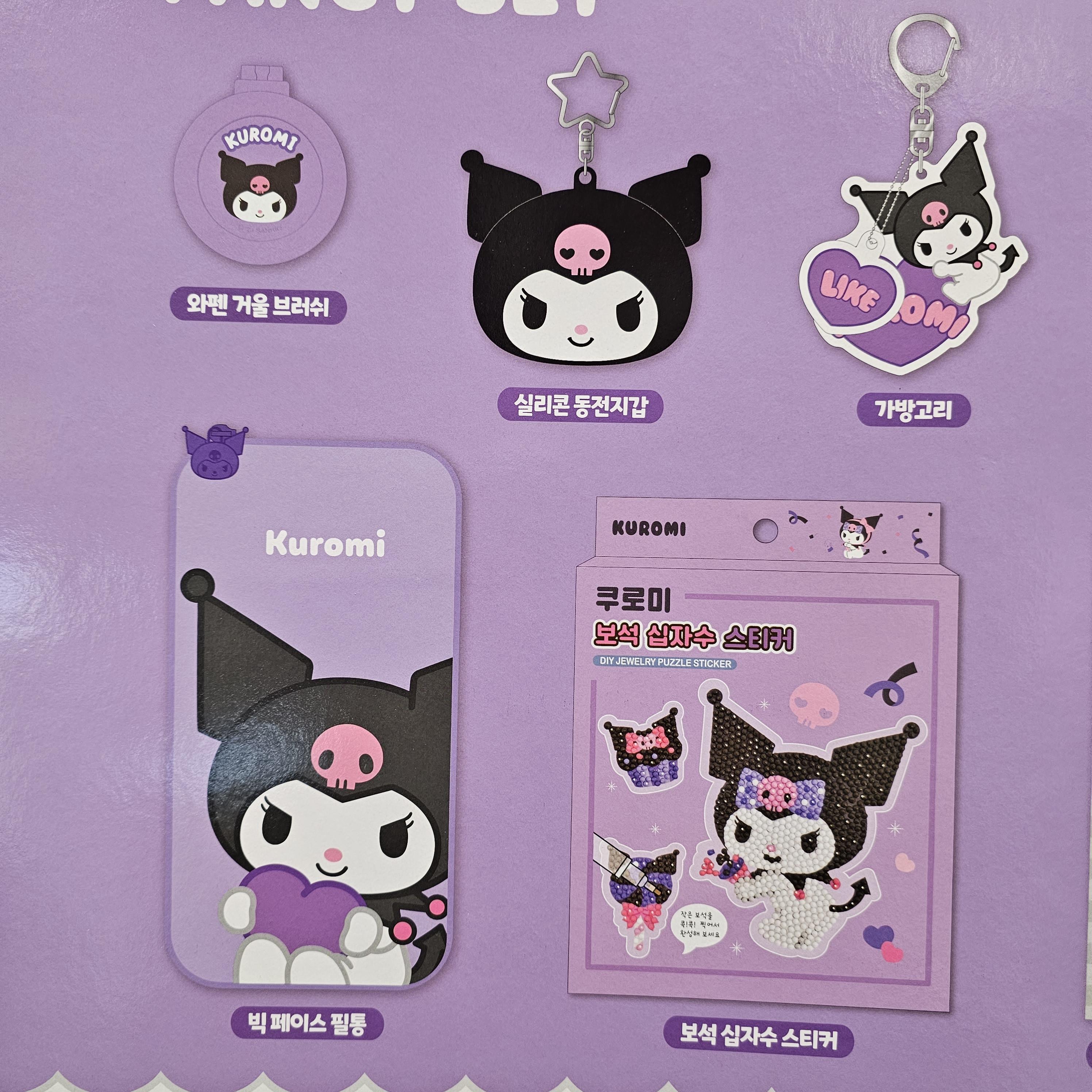 쿠로미 팬시세트 구성에 대해 보도록 하겠습니다 쿠로미 얼굴이 크게 있는 빅페이스 필통과 쿠로미 보석 십자수 스티커가 있습니다 그리고 말랑한 느낌의 실리콘 쿠로미 동전지갑이 있고요 지퍼로 열수 있게 되어 있습니다 그리고 와펜 거울 브러시가 있습니다 쿠로미몸이 전체로 나와있는 가방고리가 있고요 보라색 반투명한 젤리재질의 클리어 포토 케이스에도 키링 고리가 달려져 있고요 쿠로미 포토카드 키홀더가 또 있습니다 그리고 데코용 스티커가 들어 있으며 포토 프레임 스티커가 포함되어 있답니다 이렇게 총 9종의 쿠로미캐릭터 팬시로 구성되어 있으며 어느 하나 뺄 것 없이 다 너무 필요한 아이들이 좋아하는 것들이 들어가 있습니다